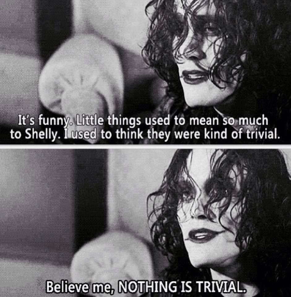 "It's funny. Little things used to mean so much to Shelly. I used to think they were kind of trivial. Believe me, Nothing is trivial."--- The Crow.