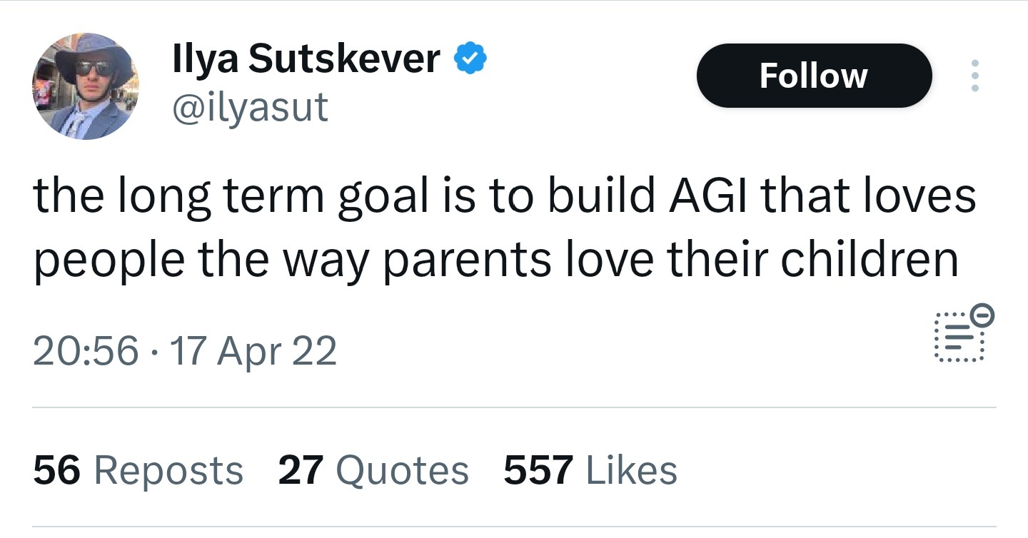 "the long term goal is to build AGI that loves people the way parents love their children",这话听起来就想赛朋小说里的大反派科学家说的话 :notlikethis: 尤其是这话还是现在被千夫指的以个人对抗大资本和上百想要发财的员工的、低物质欲的、掌握核心技术的大科学家说的,感觉更恐怖了 :ablobcatknitsweats: