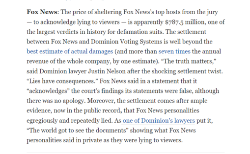 "Fox News said in a statement that it “acknowledges” the court’s findings its statements were false, although there was no apology. Moreover, the settlement comes after ample evidence, now in the public record, that Fox News personalities egregiously and repeatedly lied.