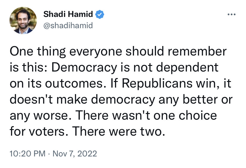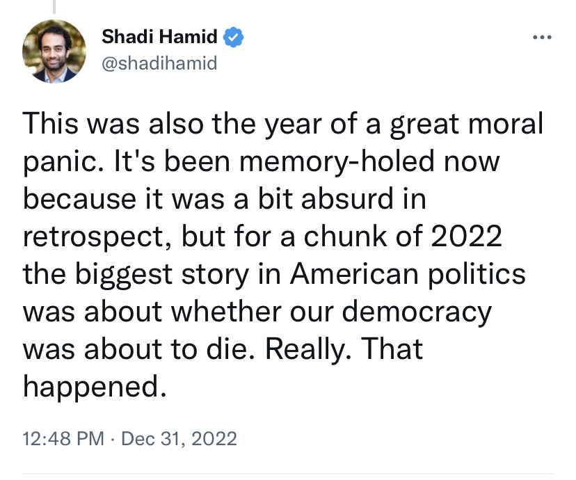 This “Democracy didn’t end on November 8 - which proves there was never any threat to democracy to begin with” stuff is so unbelievably asinine and dangerous. Hamid is one of the most consistently misleading/misled pundits in America. This is actively undermining the democratic defense. (Thread - 1/)