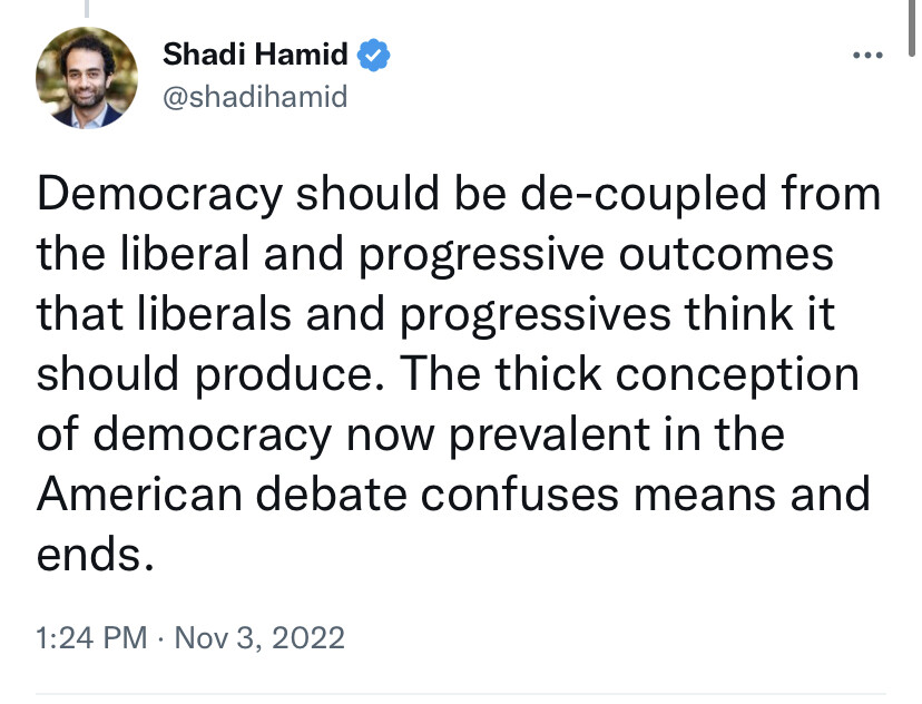 Like many of his reactionary centrist brethren, Hamid will occasionally acknowledge there might be a problem on the Right, but is focusing all his energy on the threat from the “Left.” He is obsessed with the idea that democracy has been captured by the progressive / “woke” agenda. 7/