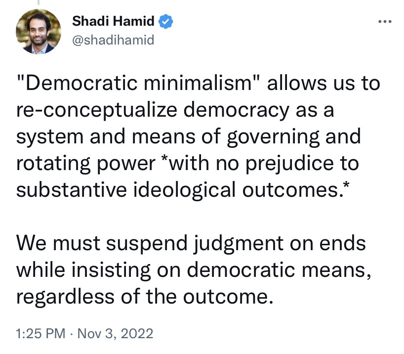 His preferred vision of “democratic minimalism” stipulates that democracy doesn’t – and shouldn’t – entail any substantive commitments: It’s just a set of procedures that produces no good or bad outcomes, just outcomes. He wants to separate the “liberal” from the “democracy.” 8/