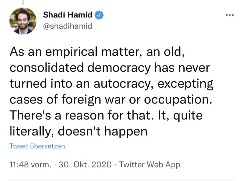 Hamid, however, doesn’t know and doesn’t care – his understanding of the past and present is shaped by simplistic myths of American exceptionalism, which is why he’s still confidently talking about this “old, consolidated democracy” being somehow immune to authoritarianism. 24/