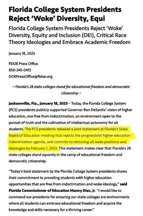 “@FLCollegeSystem Presidents just issued a vague pro-DeSantis statement promising to remove "all woke positions and ideologies" from public colleges by 2/1/23.