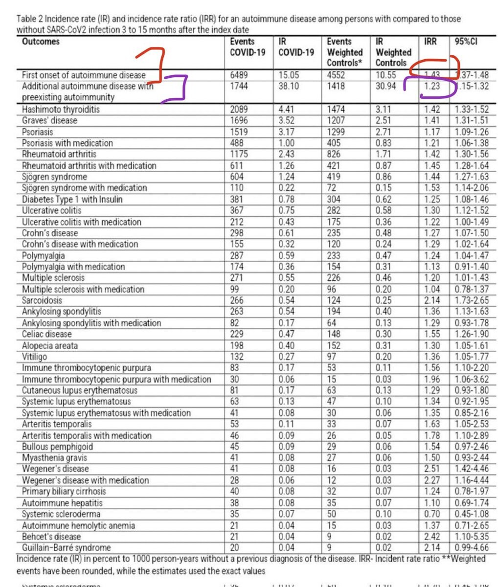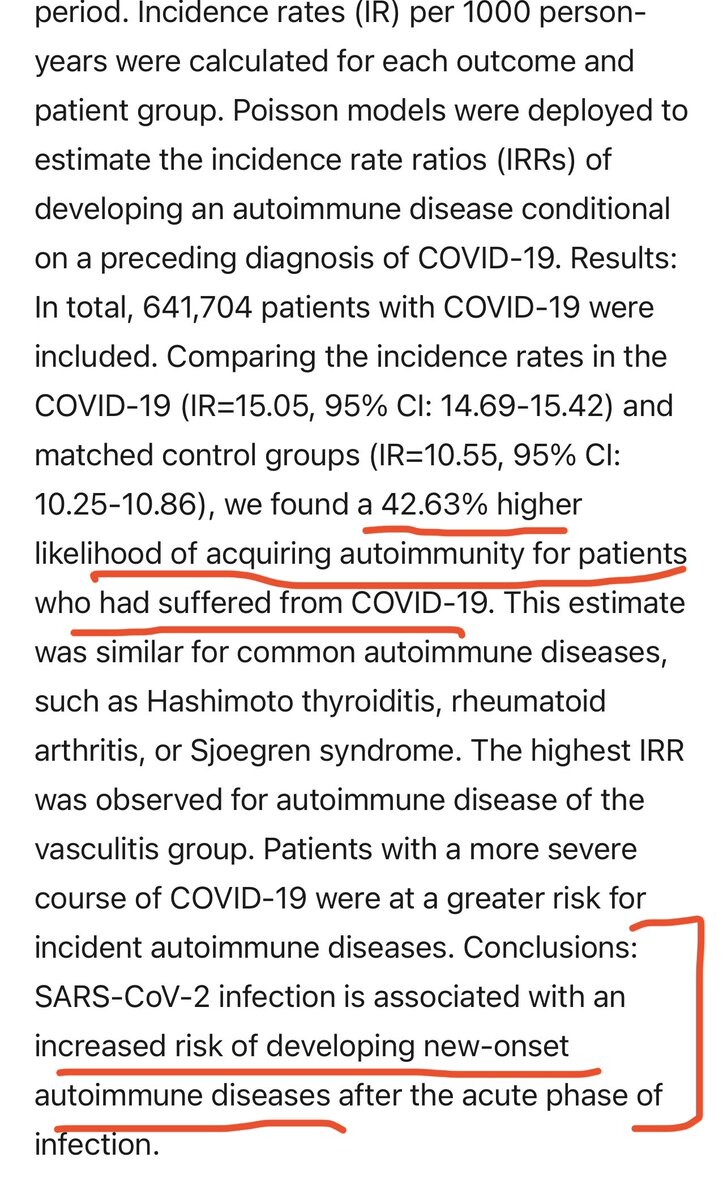 ⚠️NEW ONSET AUTOIMMUNE DISEASE—New study in 640k patients shows that #SARSCoV2 infection leads to ⬆️43% increased risk of developing **new-onset autoimmune diseases** after acute #COVID19 over. Another autoimmune disorder also exacerbated ⬆️23%. Not good! https://www.medrxiv.org/content/10.1101/2023.01.25.23285014v1
