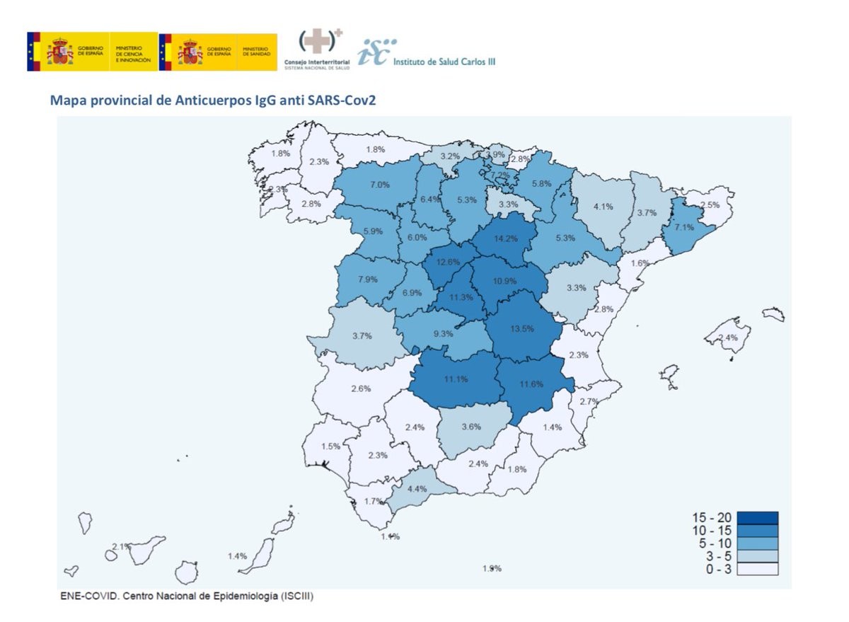 Die X-Achse beschreibt den prozentualen Anteil der positiven IgG-Antikörper-Tests in der 1. Erfassungsrunde der spanischen Antikörper-Studie. /11