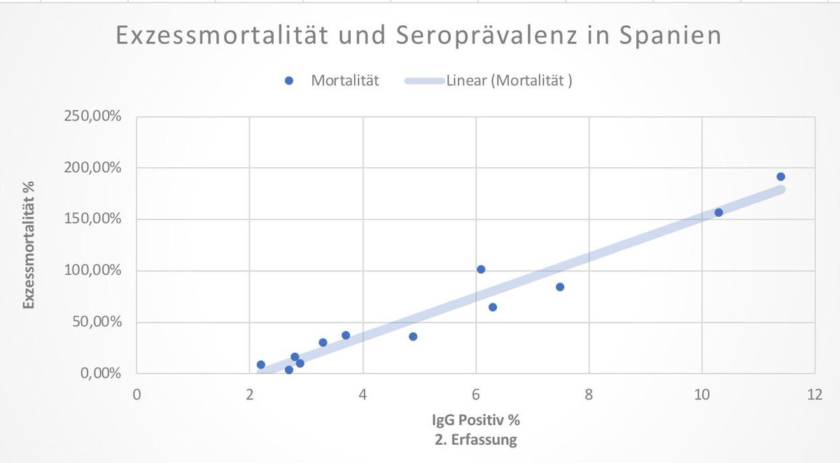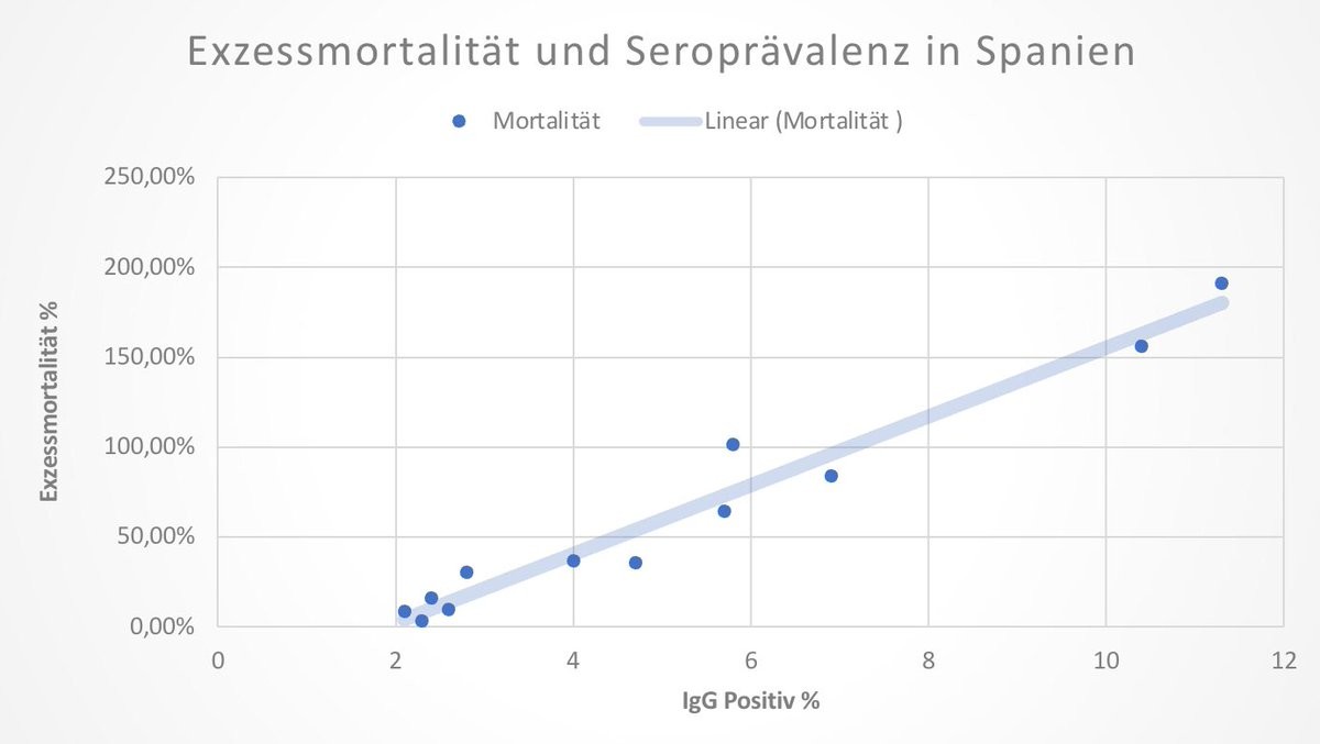 Diese Grafik zeigt die Korrelation von IgG-Positivtests mit der Exzessmortalität in den Regionen Spaniens.