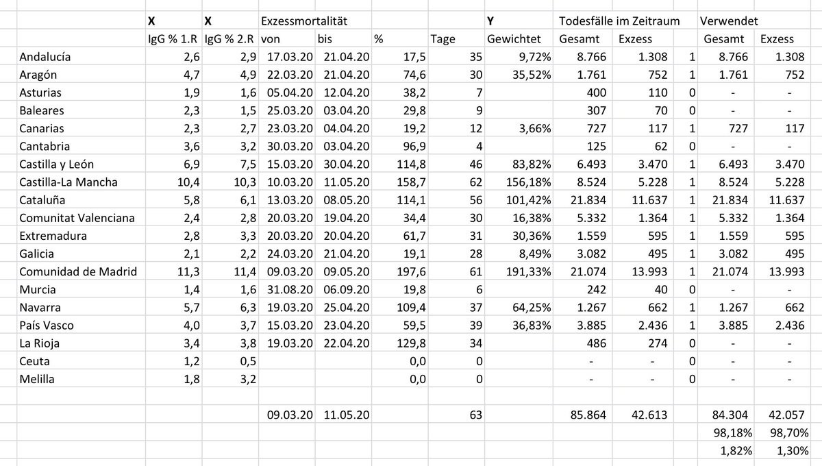 Im folgenden habe ich untersucht in wie weit die Seroprävalenz von IgG-Antikörpern in den verschiedenen Landesteilen Spaniens mit der dort jeweiligen Übersterblichkeit korreliert. /8