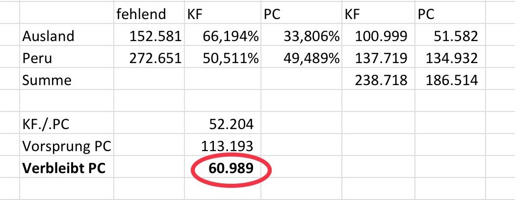 Ein kleiner Prozentsatz (11%) der ausländischen Stimmen sei noch nicht ausgezählt, aber es sei mathematisch unmöglich, dass der Wahlsieg Castillos noch verhindert wird. Zumal die nicht ausgezählten ländlichen Regionen in #Peru eher Hochburgen für Castillo sind.