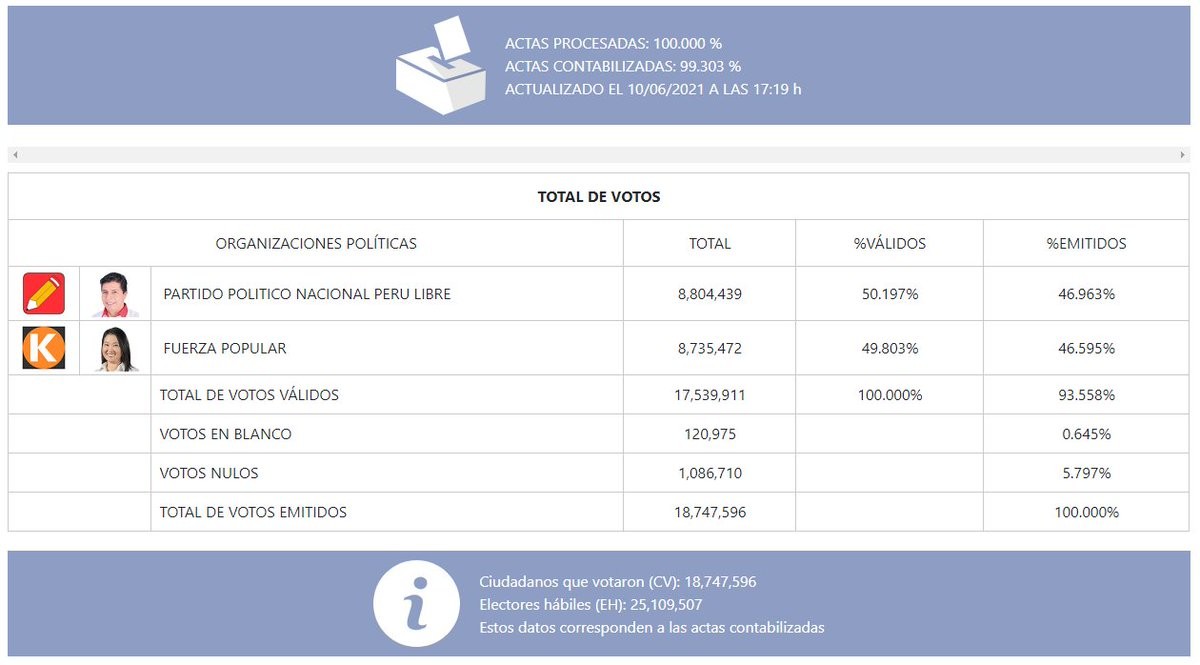 #ONPEinforma [ACTUALIZACIÓN DE RESULTADOS] Actas contabilizadas para fórmula de presidente y vicepresidentes a las 17:19 horas del 10 de junio.