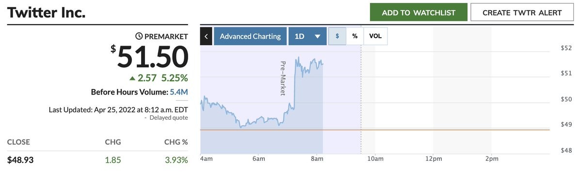 Twitter shares rose 5% premarket after Reuters said $TWTR is set to accept Tesla CEO Elon Musk's "best and final" offer to buy the company. https://trib.al/KEvdHmg