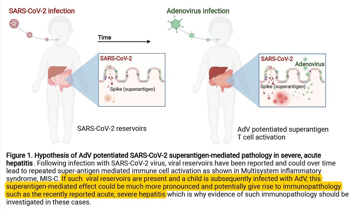 A solid hypothesis for the basis of the mysterious, severe acute hepatitis in children: superantigen formation from prior Covid viral reservoir in the GI tract with superimposed adenovirus infection https://www.thelancet.com/journals/langas/article/PIIS2468-1253(22)00166-2/fulltext @LancetGastroHep