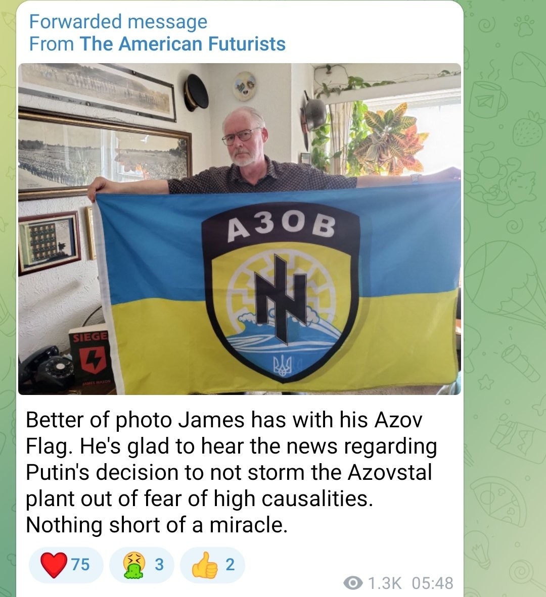Extremest Neonazi Icon, James Mason, author of the "Siege" books, posing recently with an Azov flag.