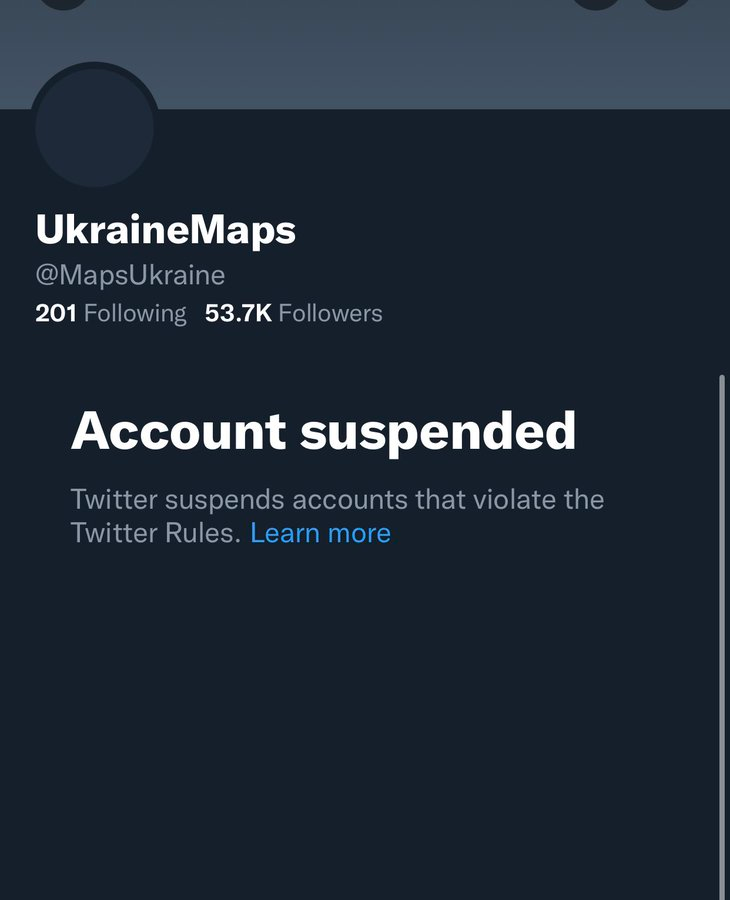 please reinstate @MapsUkraine. Providing accurate and up to date information on the war in #Ukraine cannot violate Twitter rules!