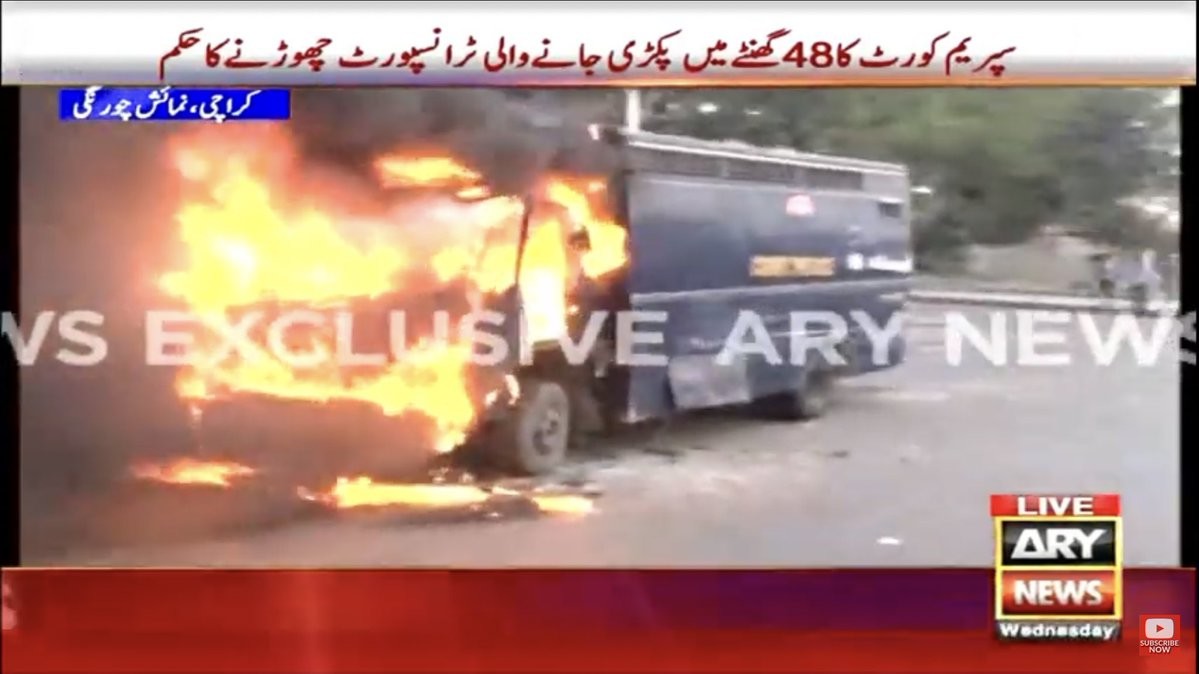 Police van burnt down as extreme violent clashes are taking place between Police and Imran Khan’s supporters in Karachi, police is firing tear gas and Rubber bullets to disperse protestors which include Women and Children. #Pakistan