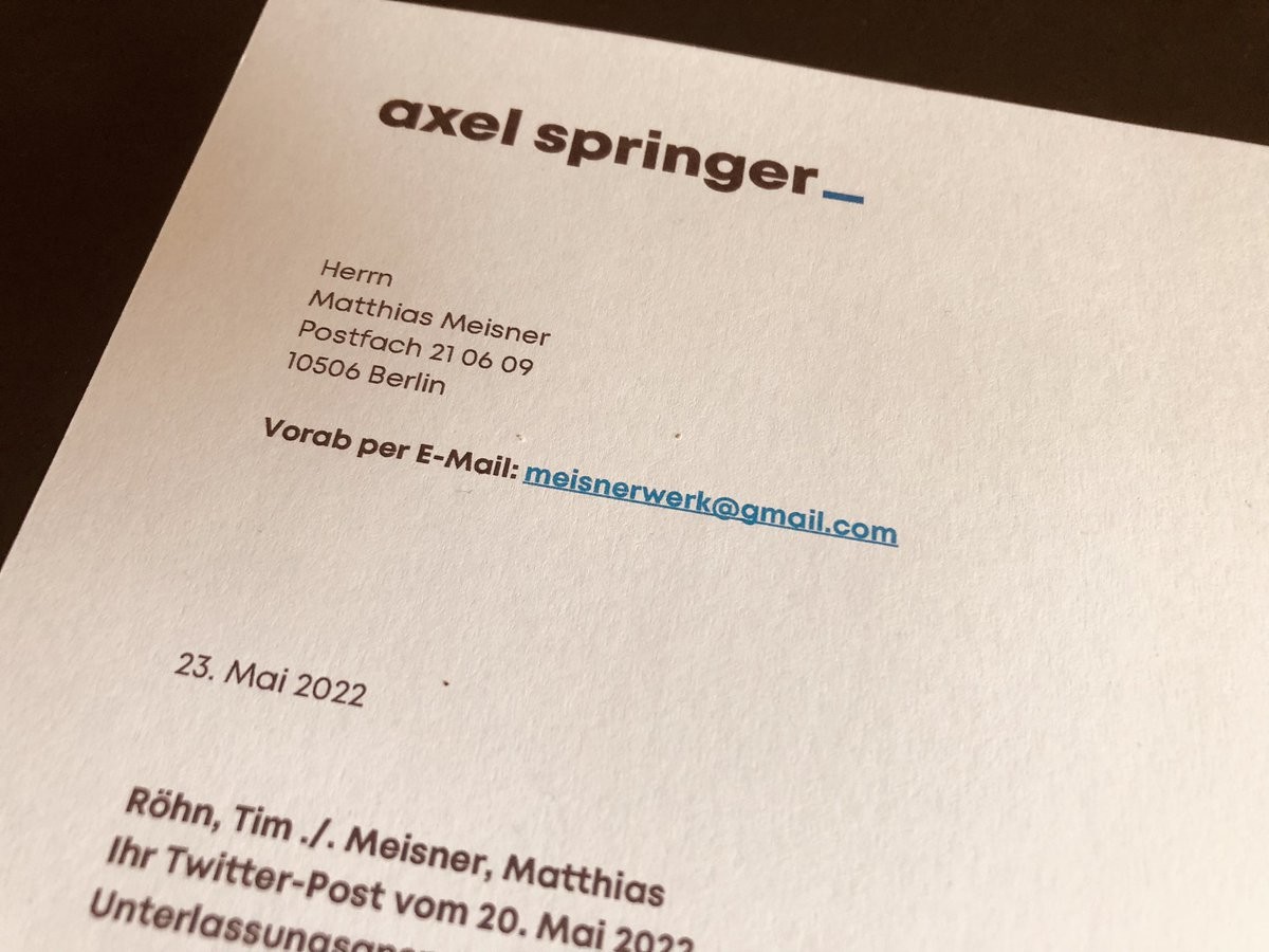 Wer @Tim_Roehn von der @welt kritisiert, muss mit Einschüchterungsversuchen rechnen. Wie so etwas läuft? Ich zum Beispiel habe gerade Post vom Justiziariat des @axelspringer-Verlags bekommen. Eine Einordnung des Vorgangs im #Thread.