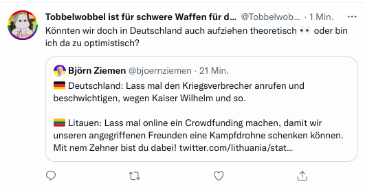 Linksliberalo Twitter hat so stabilen Wertekompass, dass man jetzt Crowdfundings machen will, um bei Erdogan (!) Bayraktar-Drohnen zu finanzieren. Ja, Erdogan, der mit den Bombardierungen von Flüchtlingslagern, Schulen, Krankenhäusern, der mit dem Giftgas und den Folterknästen.