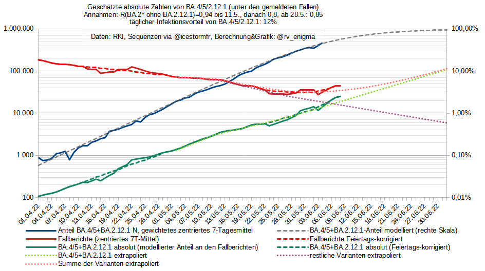 Auch bei der Graphik mit den Absolutwerten für BA.5&Co steigen die Zahlen inzwischen viel stärker als in der Extrapolation: Der Anstieg der Infektionen hat sich deutlich beschleunigt (R(BA.2)>0,9).
