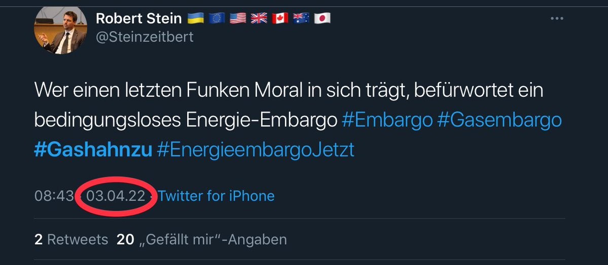 Gehört man eigentlich schon zur 5. Kolonne Putins, wenn man aktuell #Gashahnzu oder #Gasembargo fordert? Oder ist man nur Putinversteher weil es irgendwie verständlich ist, wenn Putin uns die aufgezählten Wünsche erfüllt?