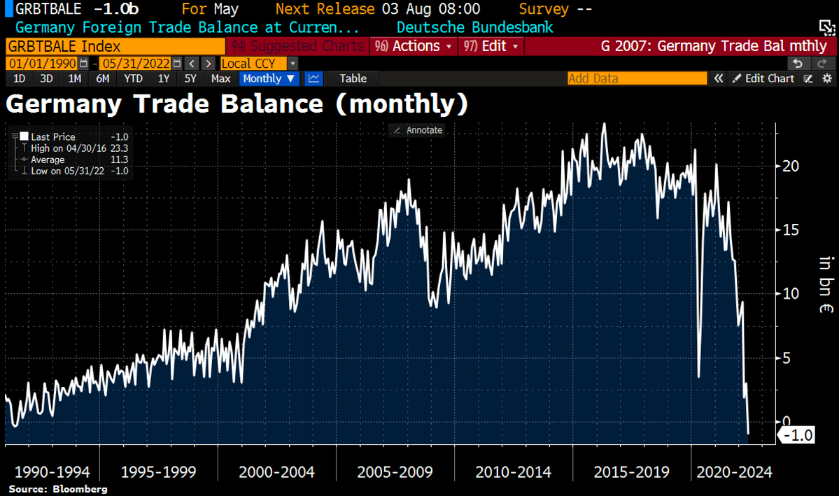 Good Morning from #Germany, which is falling as an economic powerhouse on a global scale. Germany’s trade surplus is gone. Foreign trade balance came in at MINUS €1bn in May, which is the 1st negative print since 1991 due to its energy problems & weakness in manufacturing.