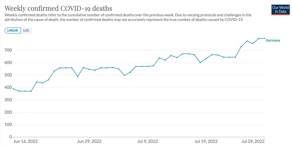 In den letzten sechs Wochen hat sich die Zahl der wöchentlichen #Corona-Toten in Deutschland von ca. 400 auf 800 verdoppelt. Das würde man mitten im Sommer eigentlich nicht erwarten.