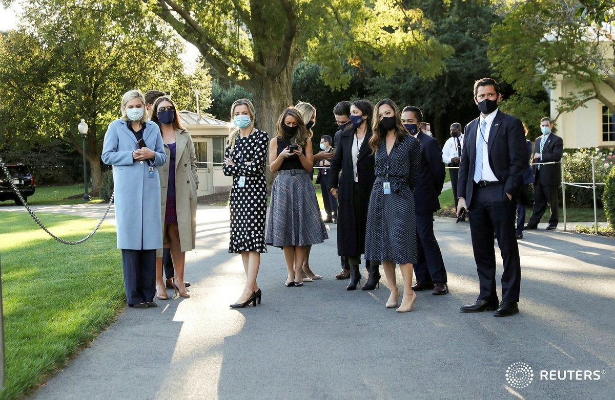 White House staff members wait to watch President Donald Trump depart by helicopter to fly to Walter Reed National Military Medical Center on the South Lawn of the White House. Photo by @LeahMillis