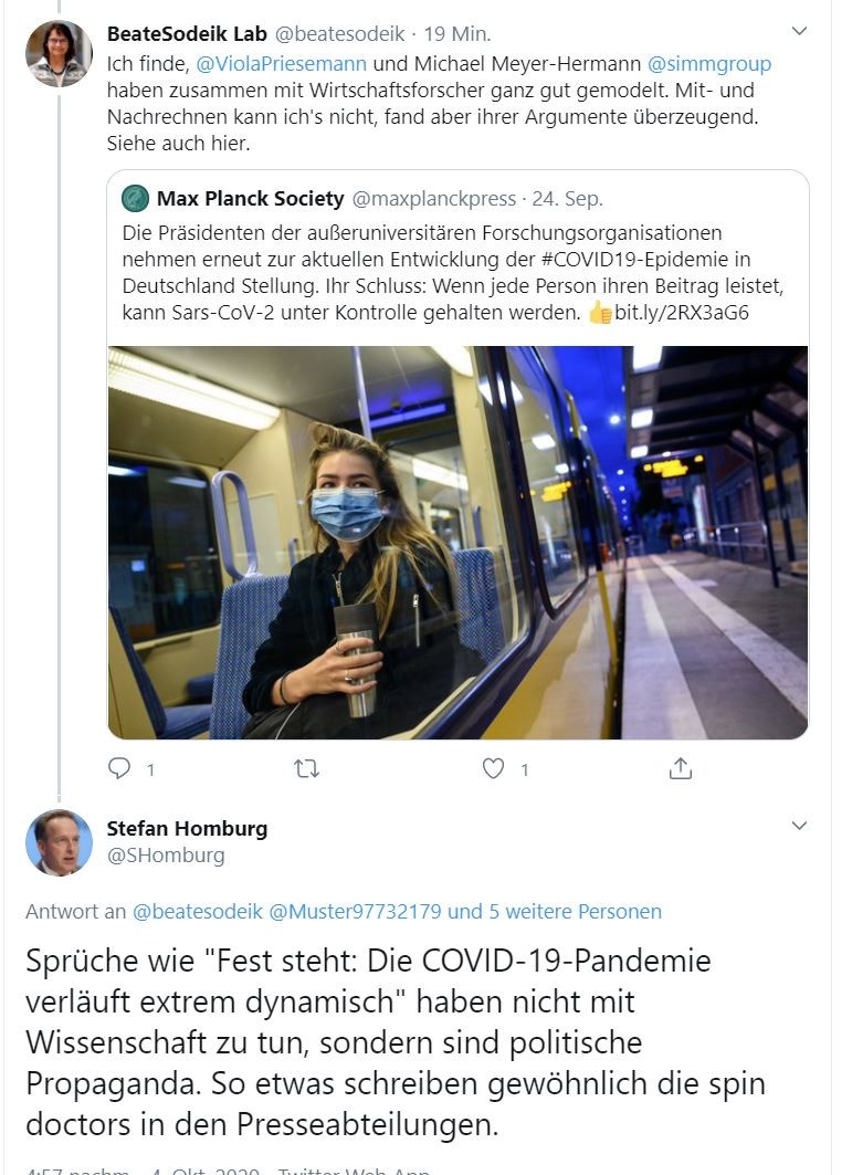 Forscher der MPG kommen auf Basis eines viel komplexeren Modells als das von (nicht überraschend) zu anderen Ergebnissen. mpg.de/15426163/stellungnahme- Dessen Kommentar: Unwissenschaftliche Propaganda. Nachweis: Der Hinweis, dass die Pandemie "extrem dynamisch" verlaufe.