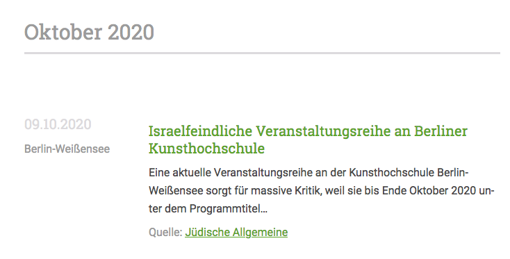 So wird #Antisemitismus verharmlost: Die @AmadeuAntonio Stiftung nimmt die Veranstaltungsreihe an der Kunsthochschule Weißensee, die von israelischen Jüdinnen organisiert wurde, in ihrer Chronik antisemitischer Vorfälle auf. https://www.amadeu-antonio-stiftung.de/chronik/
