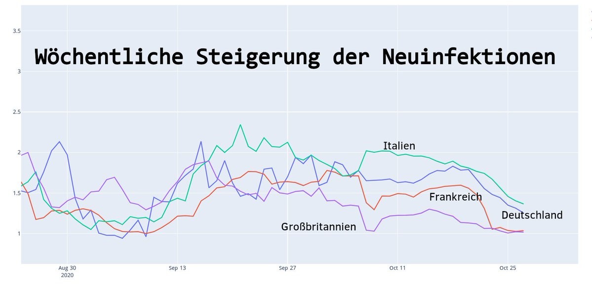 Die wöchentliche Steigerungsrate ist von ca. +80% auf etwa +25% am 27. Oktober gesunken! #CoronaVirusDE