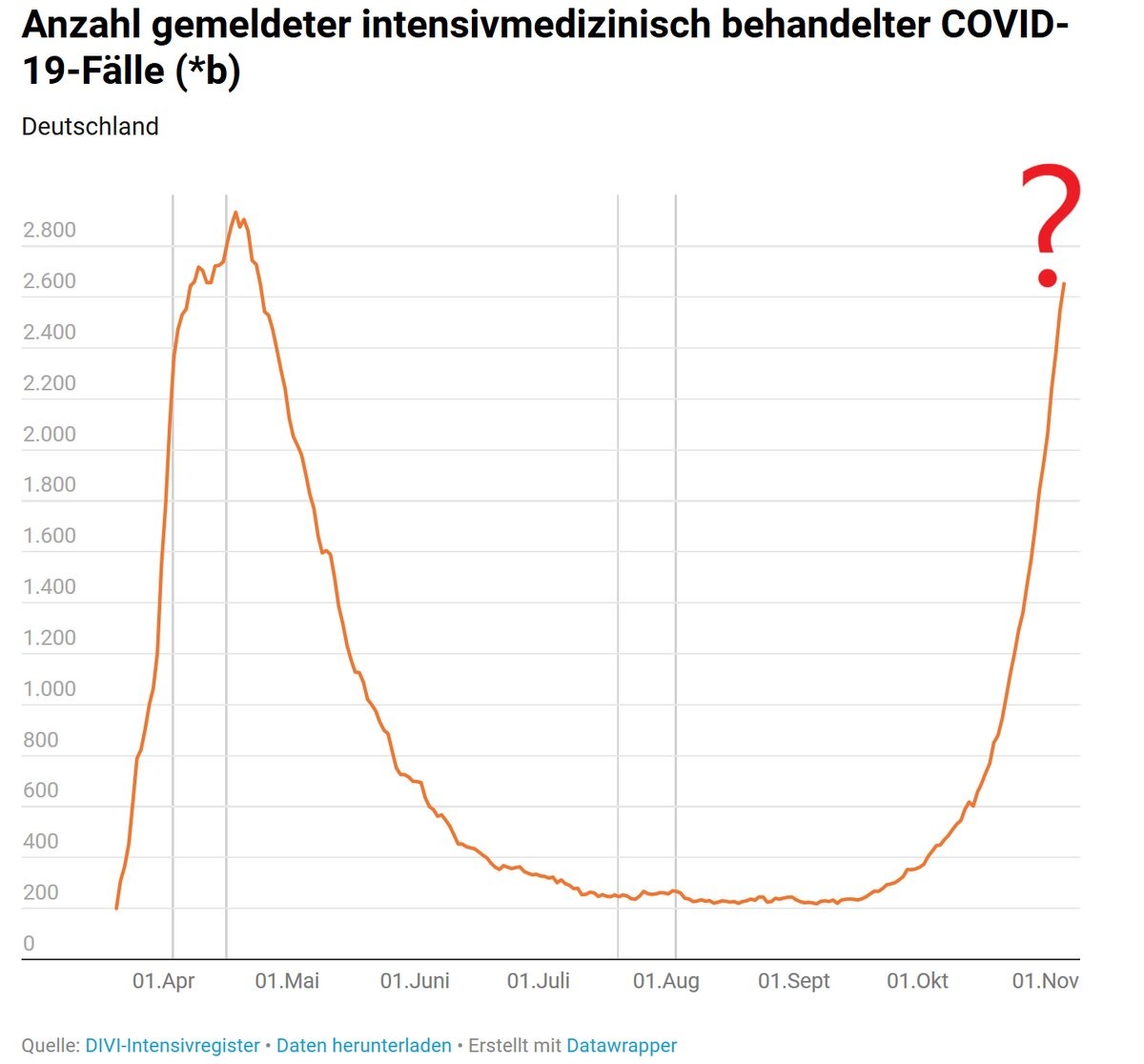 Wenn wir auf die Daten im Frühjahr schauen, sehen wir das TOP der ersten Welle am 18.4. (4 Wochen nach LD) bei 2933 intensivpflichtigen #COVID19 Fällen.