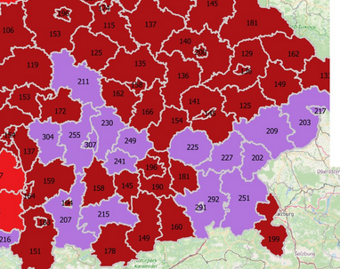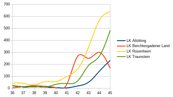 Rechts unten der einzige rote Landkreis in einem Meer von violetten Landkreisen mit über 200 Inzidenz ist übrigens Berchtesgarden. Dort wurden die Schulen am 20.10. geschlossen. Die Neuinfektionen gingen dort zurück im Rest nach oben.