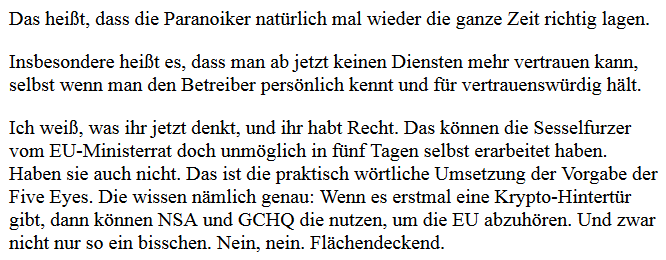"Insbesondere heißt es, dass man ab jetzt keinen Diensten mehr vertrauen kann, selbst wenn man den Betreiber persönlich kennt und für vertrauenswürdig hält."