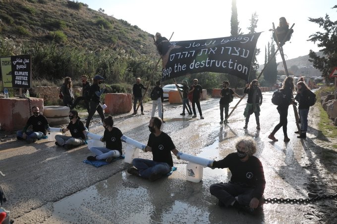 Jetzt: Klima-Aktivist_innen blockieren den Eingang zum Steinbruch von #HeidelbergCement neben einer israelischen Siedlung in der Westbank. Das deutsche Unternehmen verstößt damit gegen das Völkerrecht und zerstört ein wichtiges Naturgebiet in den palästinensischen Gebieten.