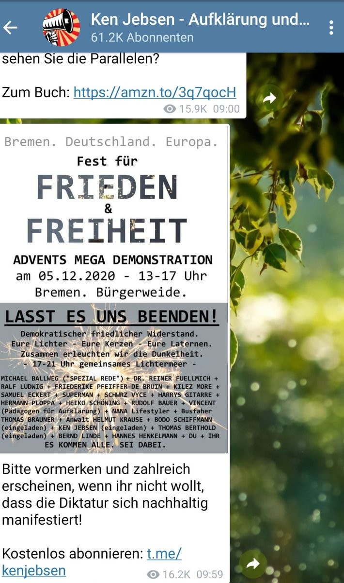 Auch der rechte Möchtegern-Journalist Ken Jebsen mobilisiert für den #hb0512 zum Aufmarsch der Corona-Rechten nach #Bremen. Ihm "folgen" allein auf telegram über 61.000 Personen. Es ist dringend an der Zeit diese Gefahr ernst zu nehmen! #AntifableibtHandarbeit