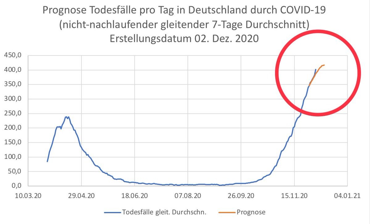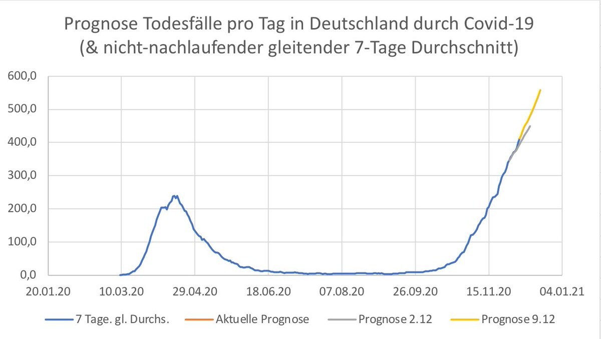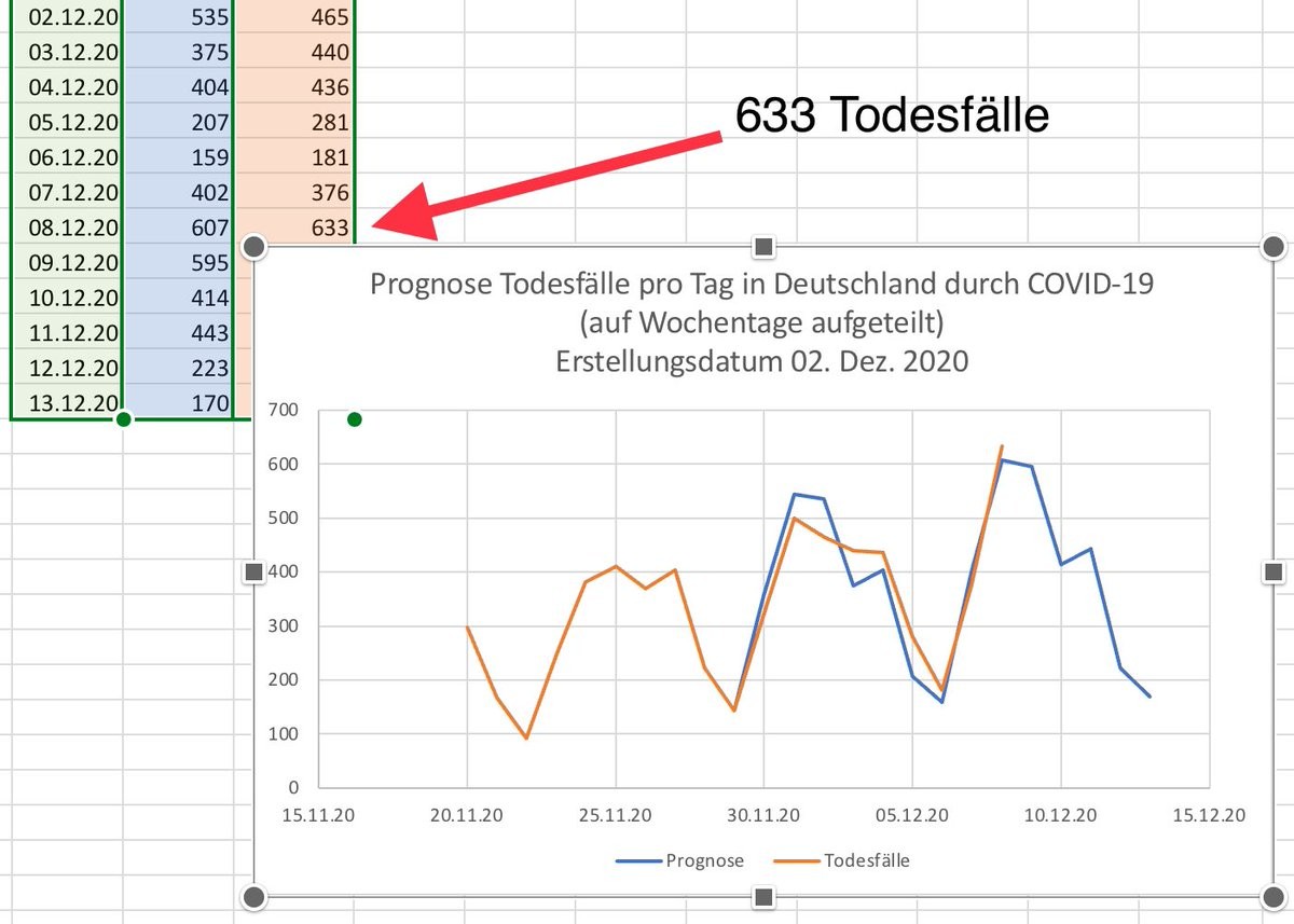 Vor 5 Tagen habe ich folgendes gepostet. Für den 8. Dezember sagte das Modell 607 Todesfälle voraus. Tatsächlich gab es heute lt. @risklayer 633 Tote.
