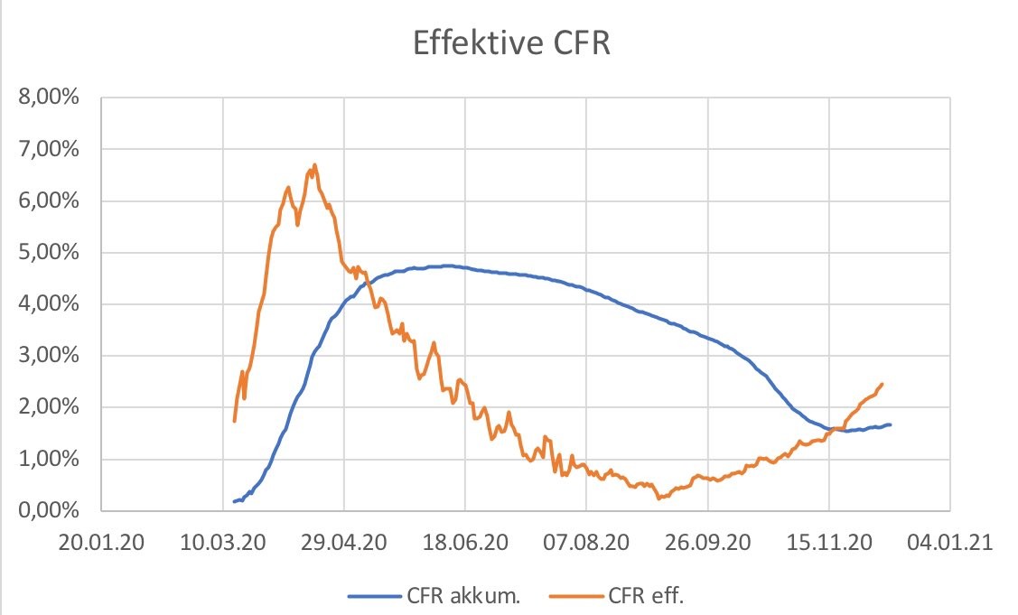 Die effektive CFR in Deutschland beträgt z.Zt. 2,46%. Das ist genau die Wahrscheinlichkeit, dass man bei einem positiven Testergebnis an Corona stirbt.