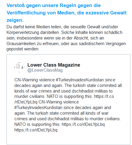 Der Tweet, den Twitter beanstandete zeigte Kriegsverbrechen der türkischen Armee und der mit ihr verbündeten Dschihadisten. Er war mit einem Content Warning versehen 1/