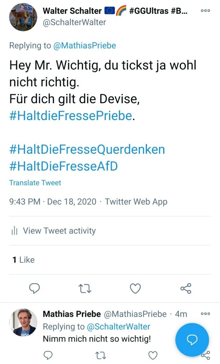 Lieber Prof. , Ihre Twitter-Aktivität ist max. irritierend. Sie bestätigen mit Ihren Likes fragwürdige Accounts u. geben damit Maßnahmen-Gegnern support. Als Medien-Profi mit Beratung dürfte das bekannt sein. Sie wurden mehrfach auf dieses Wirken hingewiesen. Vergeblich. twitter.com/Raesoneur/status/1