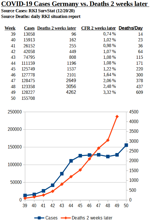 die CFR nach 2 Wochen (Case Fatality Rate=Fallsterblichkeit) erreicht in KW49 mit 3,3% leider schwindelerregende Höhen. Ich kann es mir nur so erklären, dass es daran liegt, dass Betagte bei den hohen #Infektionszahlen nicht geschützt werden können.