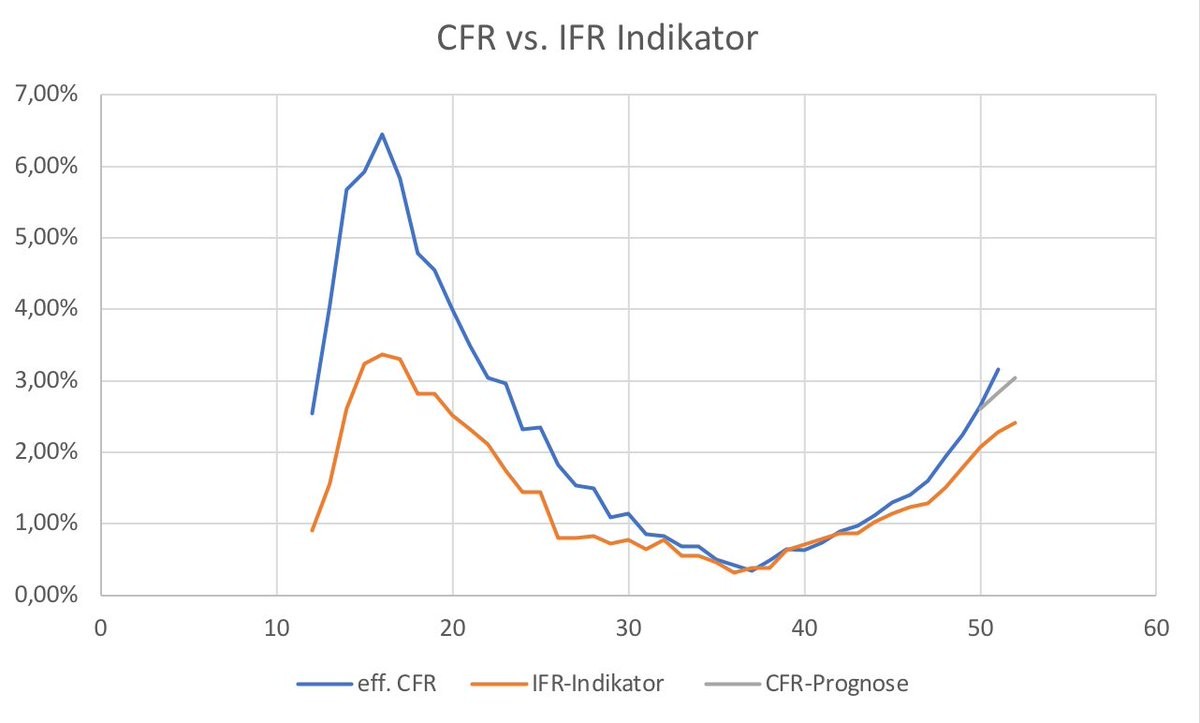2-3 Tage nach der Veröffentlichung der letzten Prognose explodierten die CFR-Werte geradezu. Die IFR hatte einen geringeren Anstieg als die CFR, d.h. die Dunkelziffer bei Älteren ist wächst stark.