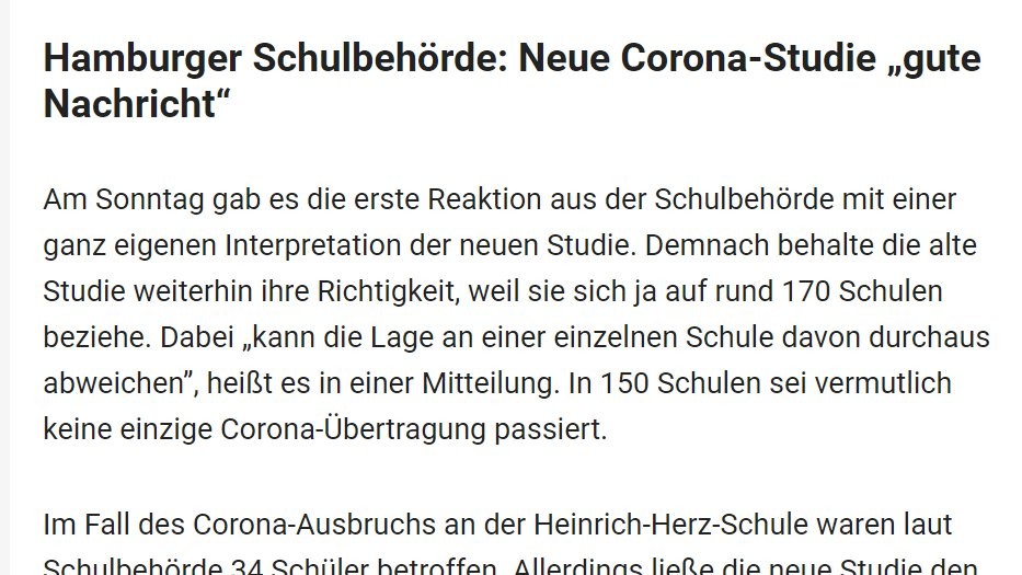 @piohh @thinktank197 @robilad @GabiElenaDohm @hh_covid @sui7_7 @K26998127 Am Sonntag gab es die erste Reaktion aus der Schulbehörde mit einer ganz eigenen Interpretation der neuen Studie: „Die Lage kann an einer einzelnen Schule davon durchaus abweichen”. Ja sicher, nur die eine Schule, an der war es anders. Alle anderen sind aber super sicher!