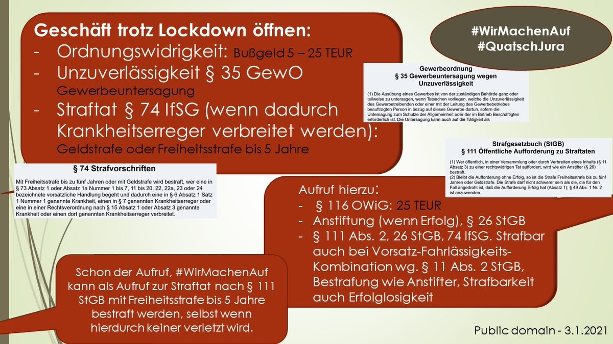 Klar kann man als Laden- oder Restaurantbetreiber ankündigen, dass man sich über Gesetze hinwegsetzen wird, braucht sich dann aber auch nicht über eine Gewerbeuntersagung wegen Unzuverlässigkeit nach 35 GewO wundern. #WirMachenAuf https://twitter.com/Time94706926/status/1345460323822825479