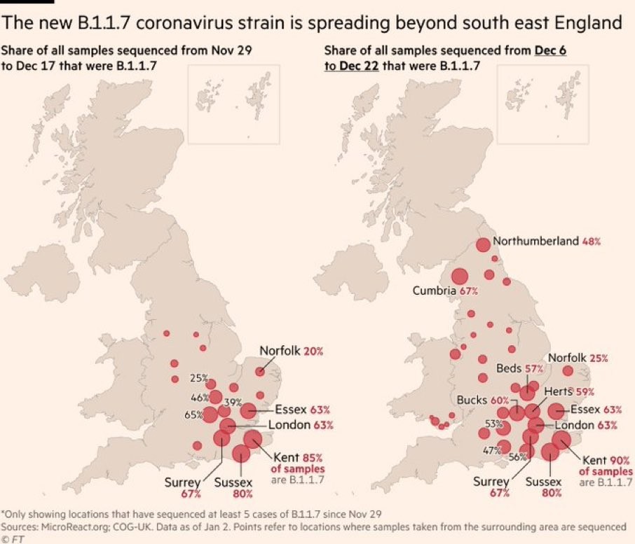 New—the new B117 strain is spreading quickly beyond just previously Southeast and lower England... to now Northern England and Wales. #COVID19