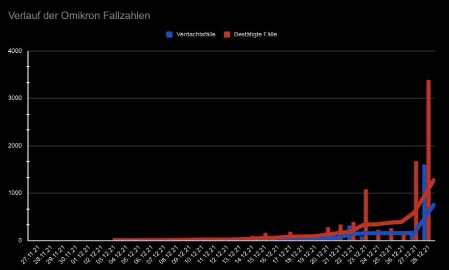 Mal wieder ein kleines Update für #omikron in DE: Auf Landkreisebene stehen wir bei 11.141 Fälle. Das RKI meldet ja nun auch täglich, dort sind’s 10.443 Fälle. Das passt also. Hier noch der Verlauf der vergangenen Tage. Über Weihnachten war’s wie erwartet sehr ruhig.