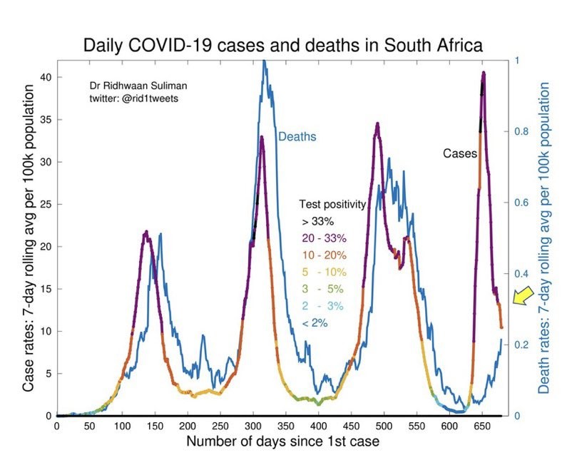 📍Really interesting that SA deaths are increasing a lot, more than a month after the peak in cases. #Omicron is not following the usual 14-21 day lag seen for other waves. Also, there is large >30% excess deaths above historical average—3000 excess/week.