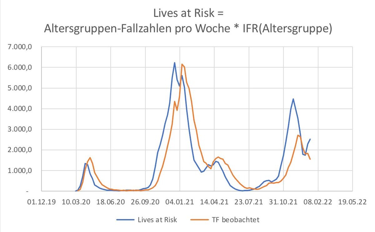 Wenn Omikron genauso tödlich gewesen wäre wie Delta, dann hätte es für die letzte Szenario-Woche (Fr.-Do.) vermutlich 511 Todesfälle mehr gegeben. Das wäre +30,0%. Insgesamt gab es 1.174 Todesfälle.