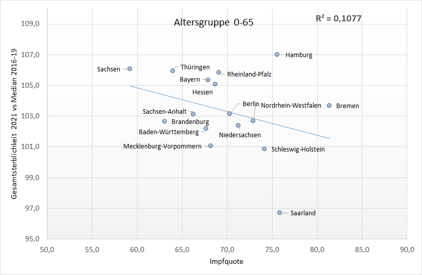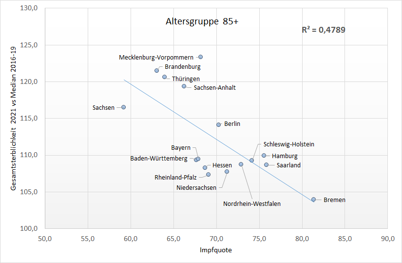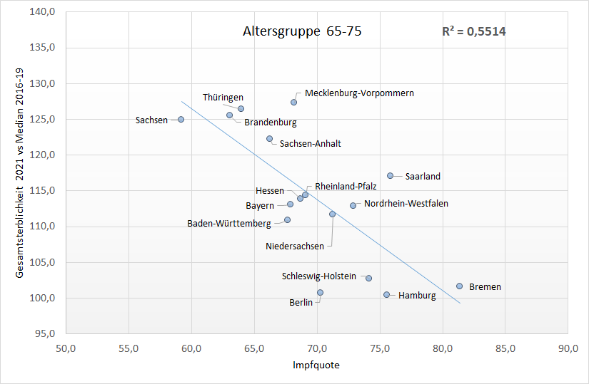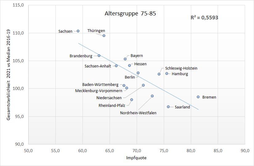 Mittlere bis hohe negative Korrelation zwischen Impfquote und Übersterblichkeit in den Altersgruppen 65-75, 75-85 und 85+