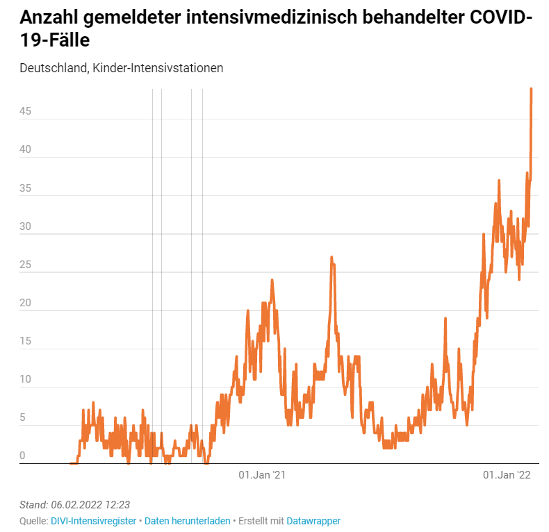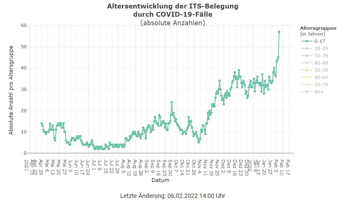 Zwölf Kinder mehr als gestern auf ITS wg Covid. Mit Abstand der stärkste Anstieg bisher, mehr als 26% innerhalb 1d. Insgesamt sind es damit heute 57 Kinder auf ITS, viel mehr als je zuvor.