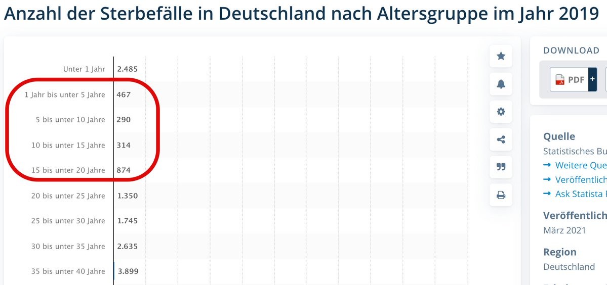 Bei der Beurteilung des Risikos von Kindern wird seit Beginn der #Pandemie der Fehler gemacht, ihr Risiko mit dem von Erwachsenen zu vergleichen. Dabei ergibt es sehr viel mehr Sinn, mit dem Risiko zu vergleichen, mit dem Kinder an anderen Ursachen versterben.