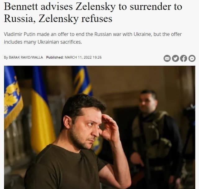 "Der israelische Ministerpräsident Naftali Bennett riet dem ukrainischen Präsidenten #Selenskyj, die Kapitulationsbedingungen zu akzeptieren, damit Russland abzieht. Zelensky lehnte den Rat ab."